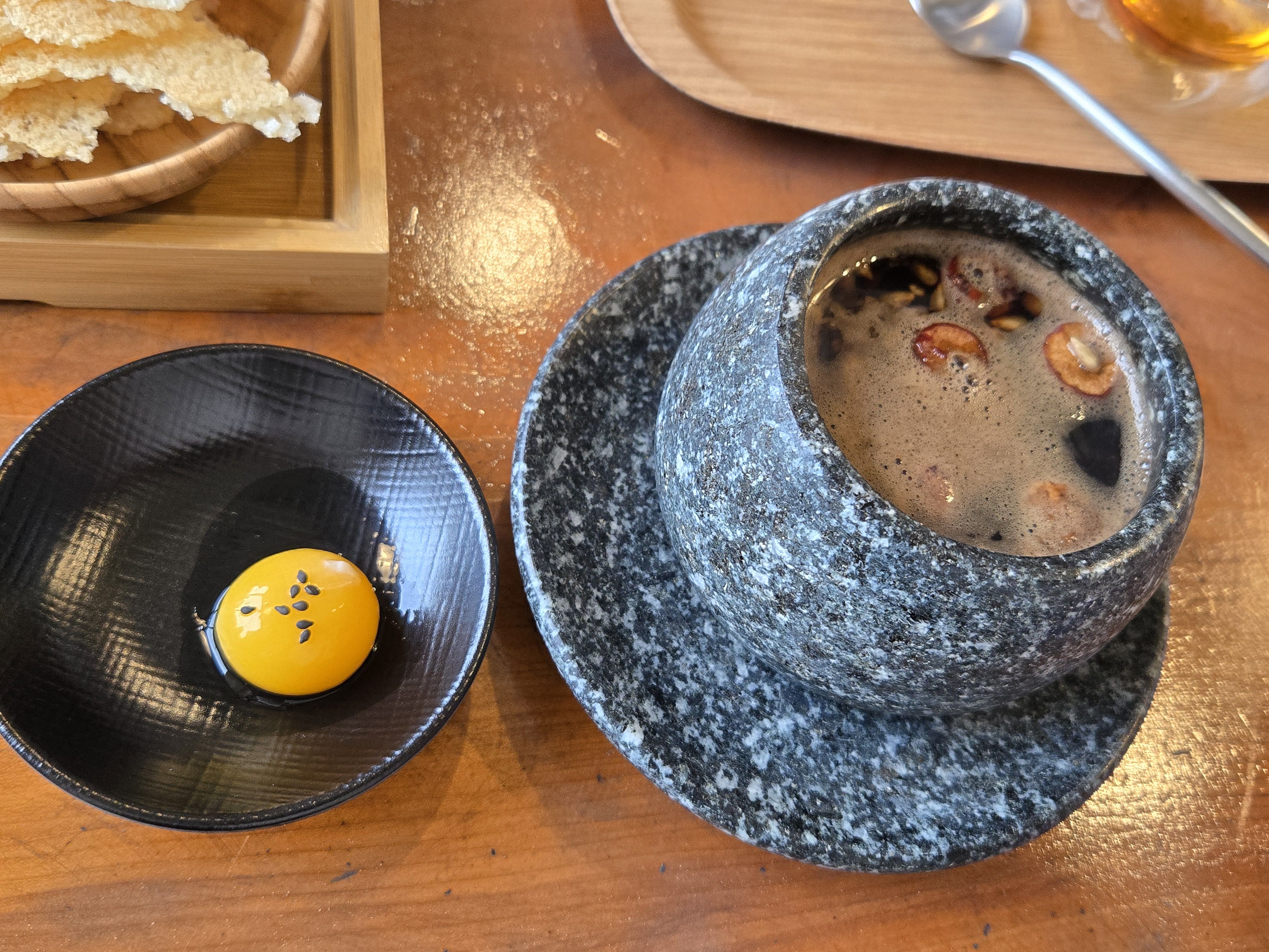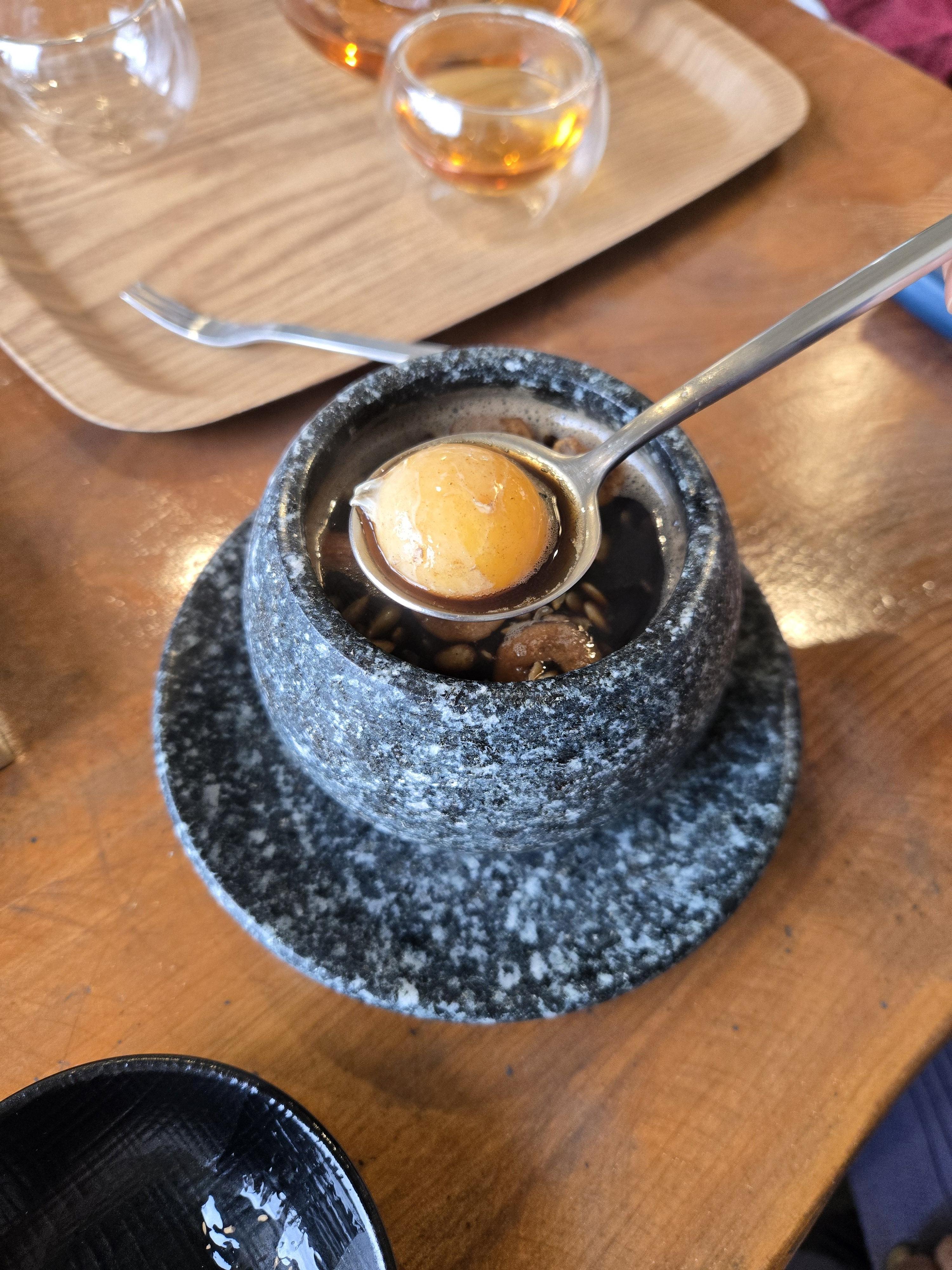 그래서 쌍화차 노른자 먹는 법은, 노른자가 터지지 않도록 쌍화차 안에서 살짝 안에 넣었다가 반숙처럼